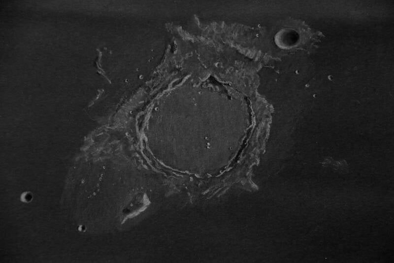 Maankrater Archimedes: wit potlood (Faber-Castell 101) , blending tool, houtskool, aquarel chinees wit